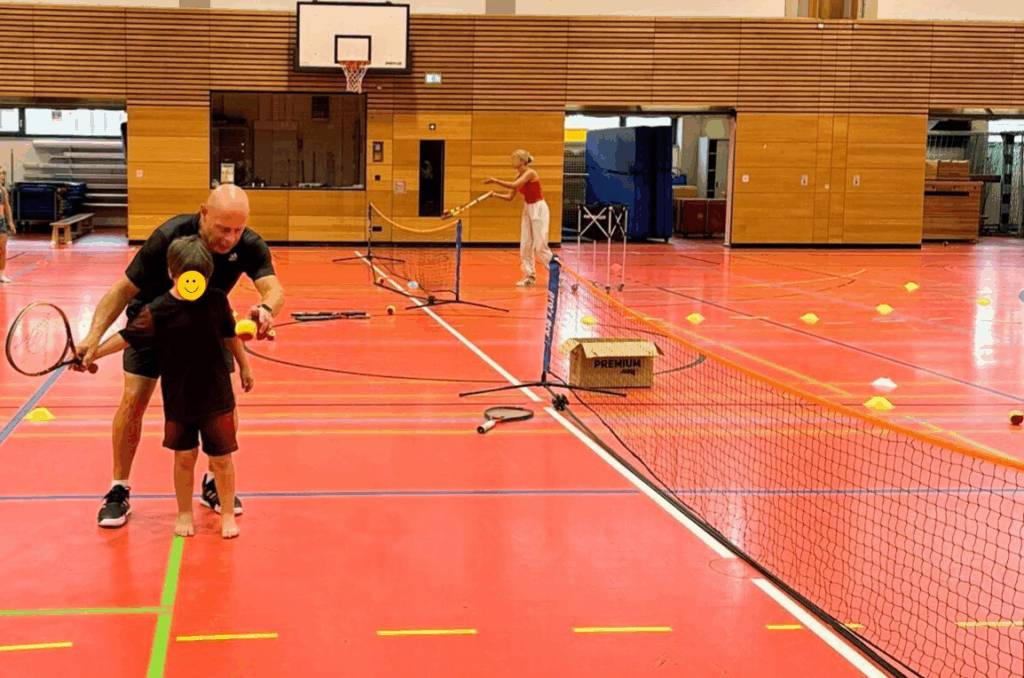 An manchen Stationen warten die Kinder auch geduldig, bis sie an der Reihe sind. Nachdem er schon Fußball, Leichtathletik, Basketball und den Radparcours ausprobiert hat, stand Maximilian am Tennisnetz an. Voller Vorfreude, ganz gespannt und in gespannter Erwartung, wie es sich wohl anfühlen würde, zum ersten Mal einen Tennisschläger in der Hand zu halten.